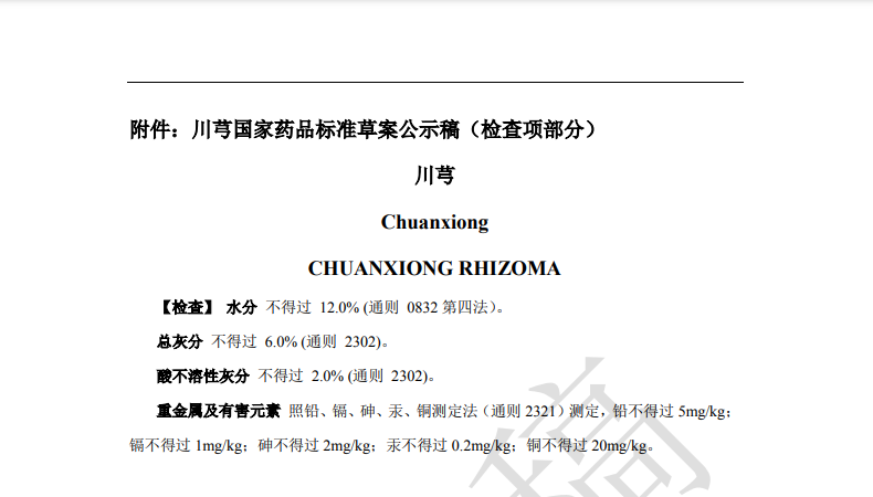 本次草案修訂,主要是根據(jù)產(chǎn)品重金屬及有害元素蓄積及與土壤相關(guān)性研究結(jié)果,擬新增重金屬與有害元素檢查項(xiàng)。均要求【重金屬及有害元素】照鉛、鎘、砷、汞、銅測(cè)定法(通則2321)測(cè)定,鉛不得過(guò) 5mg/kg;鎘不得過(guò)1mg/kg;砷不得過(guò)2mg/kg;汞不得過(guò) 0.2mg/kg;銅不得過(guò) 20mg/kg。