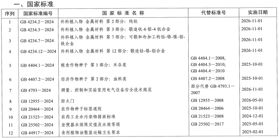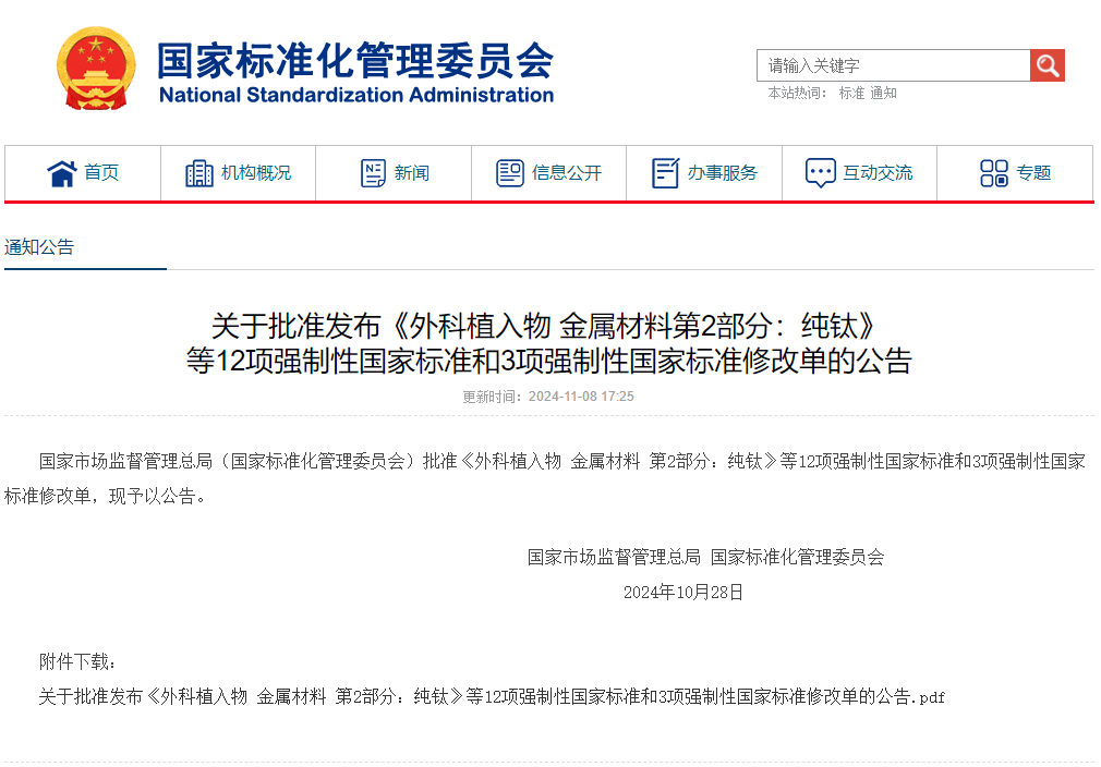 關(guān)于批準發(fā)布《外科植入物 金屬材料第2部分:純鈦》等12項強制性國家標準和3項強制性國家標準修改單的公告