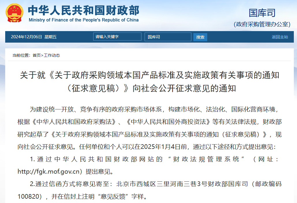 近日,財政部在其官方網(wǎng)站上發(fā)布了《關(guān)于政府采購領(lǐng)域本國產(chǎn)品標準及實施政策有關(guān)事項的通知(征求意見稿)》,并向社會各界公開征求意見。該通知旨在構(gòu)建統(tǒng)一開放、競爭有序的政府采購市場體系,保障各類經(jīng)營主體平等參與政府采購活動,并明確提出在政府采購活動中,給予本國產(chǎn)品相對于非本國產(chǎn)品20%的價格評審優(yōu)惠。