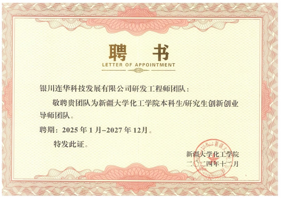 隨后在熱烈的掌聲中,雙方代表簽署了合作協(xié)議,正式確立合作關(guān)系。新疆大學(xué)還為銀川連華頒發(fā)了本科生/研究生創(chuàng)新創(chuàng)業(yè)導(dǎo)師團(tuán)隊聘書,進(jìn)一步深化人才交流與合作。最后,在眾人的期待與矚目下,黃雪莉院長與紀(jì)飛總經(jīng)理一同走向揭牌處,鄭重地揭開紅綢,宣告新疆大學(xué)化工學(xué)院與連華科技聯(lián)合實驗室正式成立。