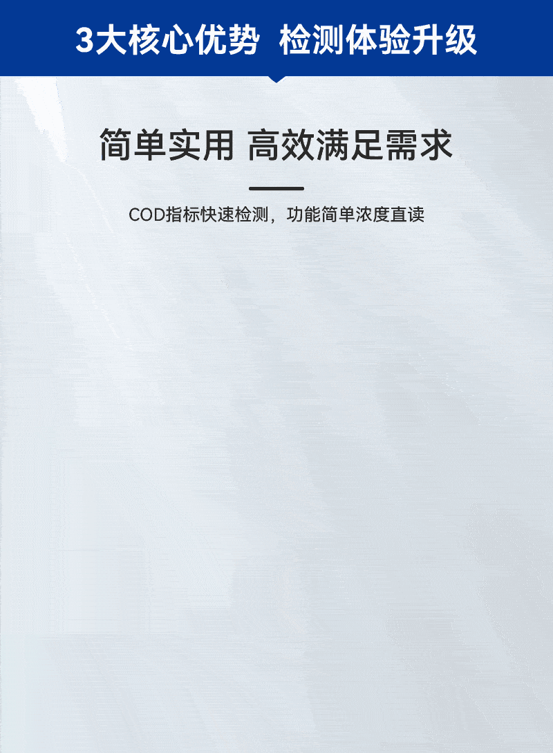 1、簡(jiǎn)單實(shí)用高效滿足需求,COD指標(biāo)快速檢測(cè),功能簡(jiǎn)單濃度直讀