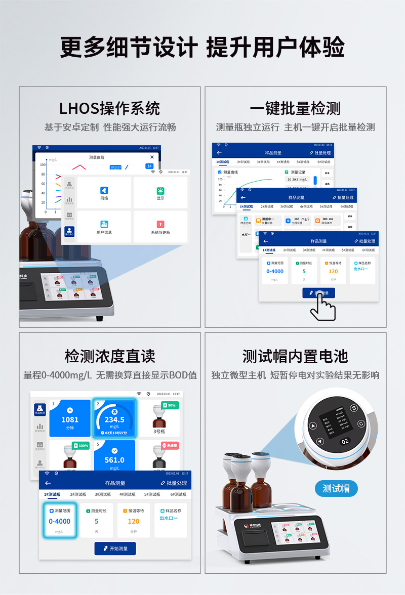 4.量程0-4000mg/L,檢測濃度直讀,無需換算直接顯示BOD值,采用安卓系統(tǒng)算法更新,硬件升級低量程測值更準(zhǔn);