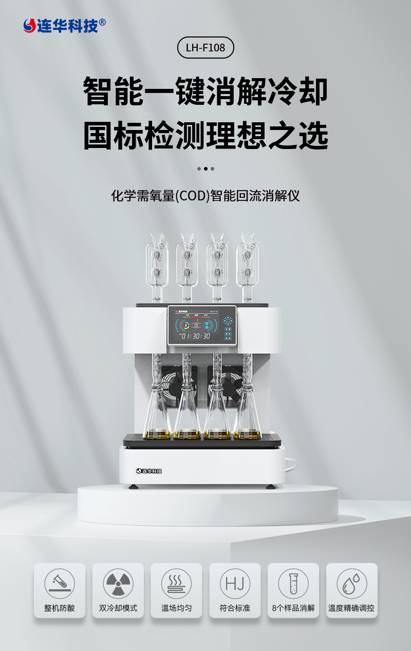 化學(xué)需氧量(COD)智能回流消解儀LH-F108 該儀器依據(jù)國家新標(biāo)準(zhǔn)《HJ828-2017 水質(zhì)化學(xué)需氧量的測定重鉻酸鹽法》設(shè)計(jì)制造,同時(shí)兼顧原國標(biāo),適用于各種生活用水和工業(yè)廢水的檢測,儀器內(nèi)置回流系統(tǒng),可智能定時(shí),操作簡單