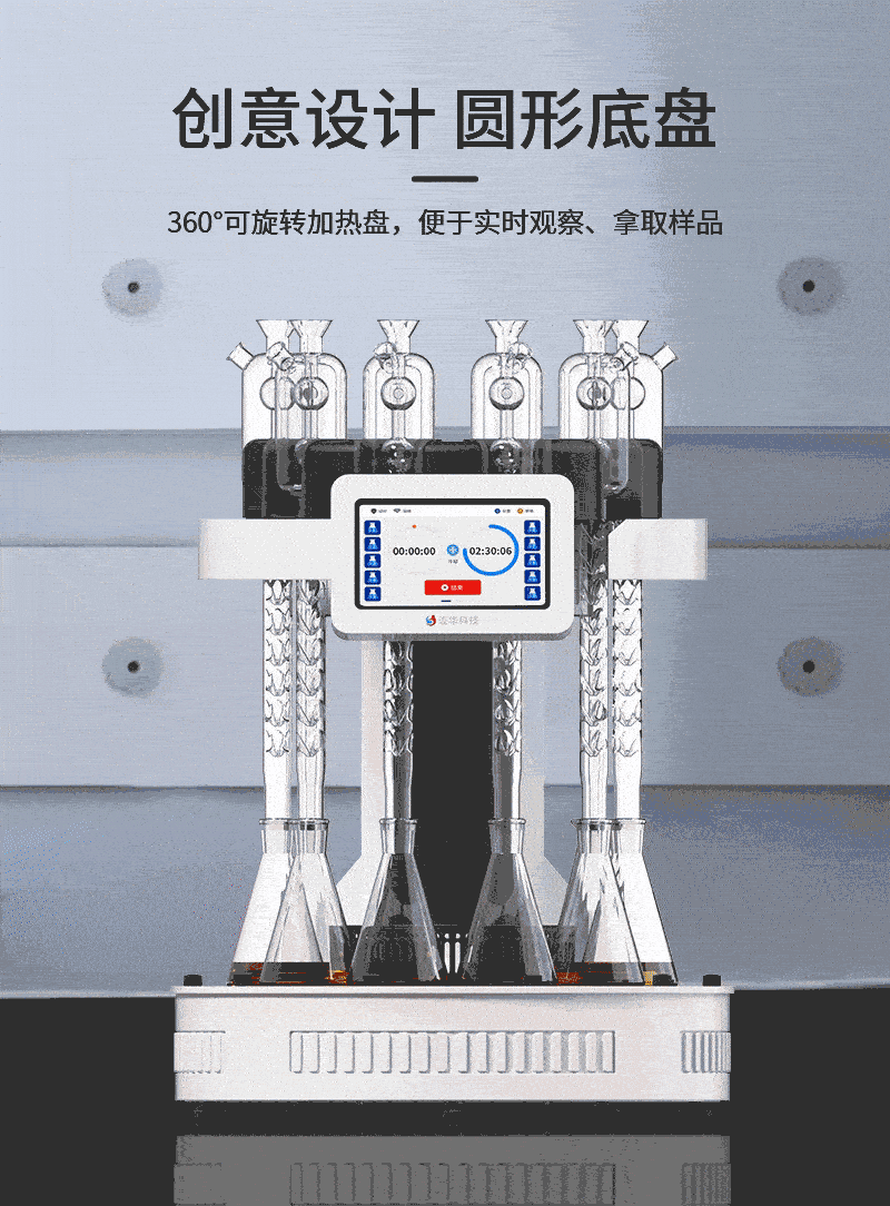 3、旋轉(zhuǎn)底盤:加熱盤采用左右可旋轉(zhuǎn)360°設(shè)計(jì),便于用戶實(shí)時(shí)觀察樣品消解狀態(tài),快速添加耗材、拿取樣品;