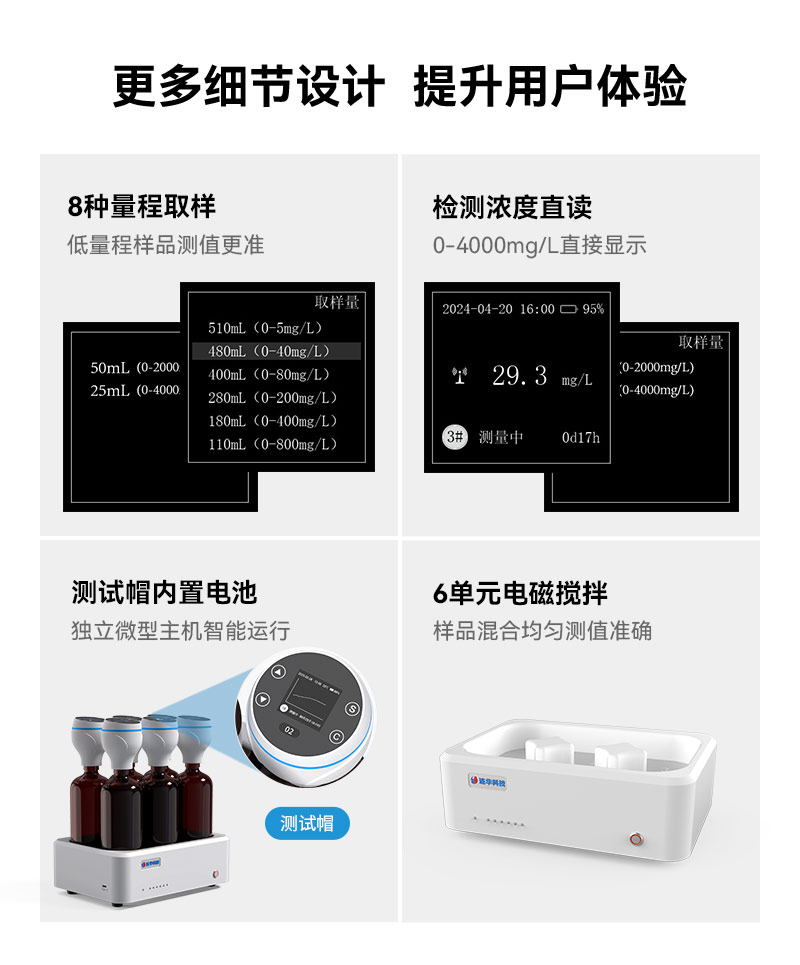3、量程0-4000mg/L,支持8種量程取樣選擇,檢測濃度直讀,無需換算直接顯示BOD值,硬件升級低量程測值更準(zhǔn);